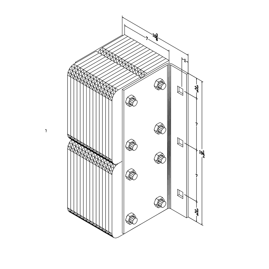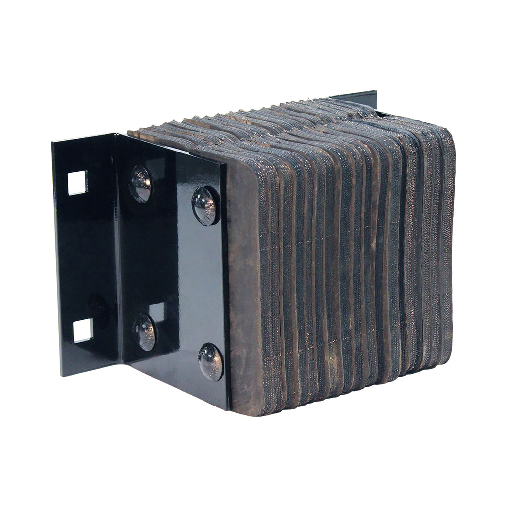 - Rubber pads laminated between structural steel angles and secured with 3/4" steel tie rods